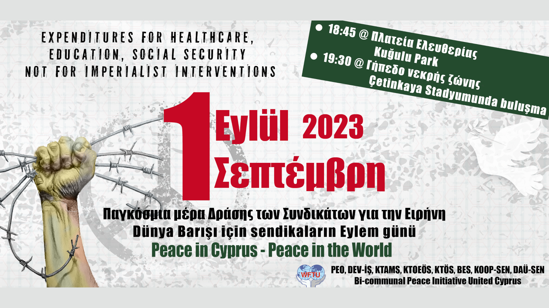 – 19:30 Converge with the march of Turkish Cypriot trade union organisations at Ledra Palace. Joint meeting and reading of a joint declaration.