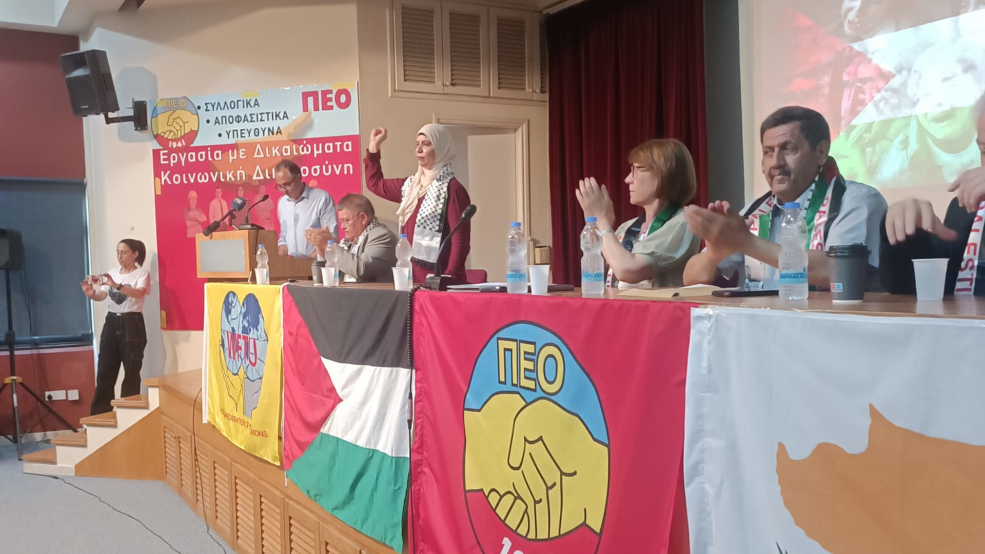 In her address, PEO General Secretary Sotiroulla Charalambous stated that “PEO, as part of the international class movement under the umbrella of the WFTU, stands firmly and over time on the side of the Palestinian workers and the Palestinian people in general. This is what we have always done, this is what we have been doing since the first moment of the Palestinian genocidal operation in Gaza.”
