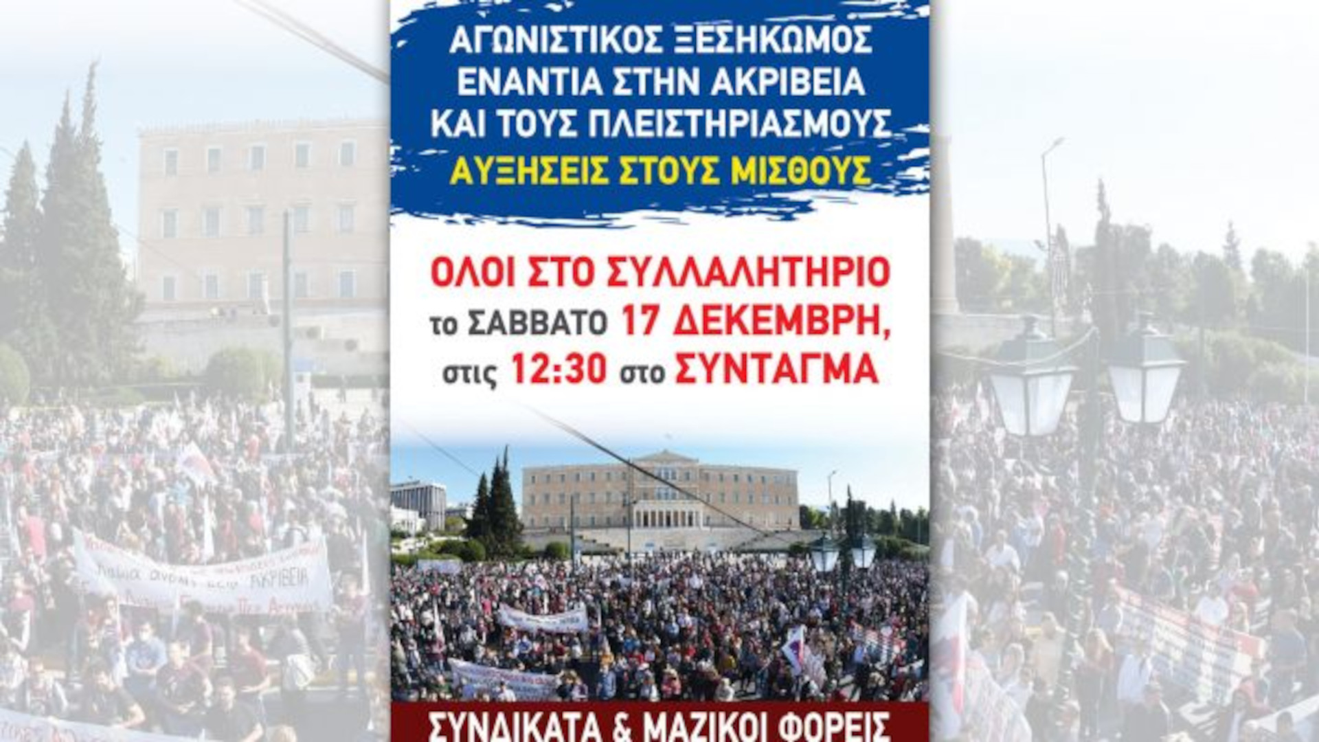 We call on the collective organs of the trade unions without any delay to start the engines of struggle, with meetings of the Boards, with general assemblies, with multiform action and initiatives to reach every worker, in every office, factory, industry, ship, neighborhood, everywhere. The Regional Trade Union Centres of Attica and all the unions to take decisions for a work stoppage, to flood Athens on Saturday December 17 with our people who are demanding, to put our needs in the forefront.