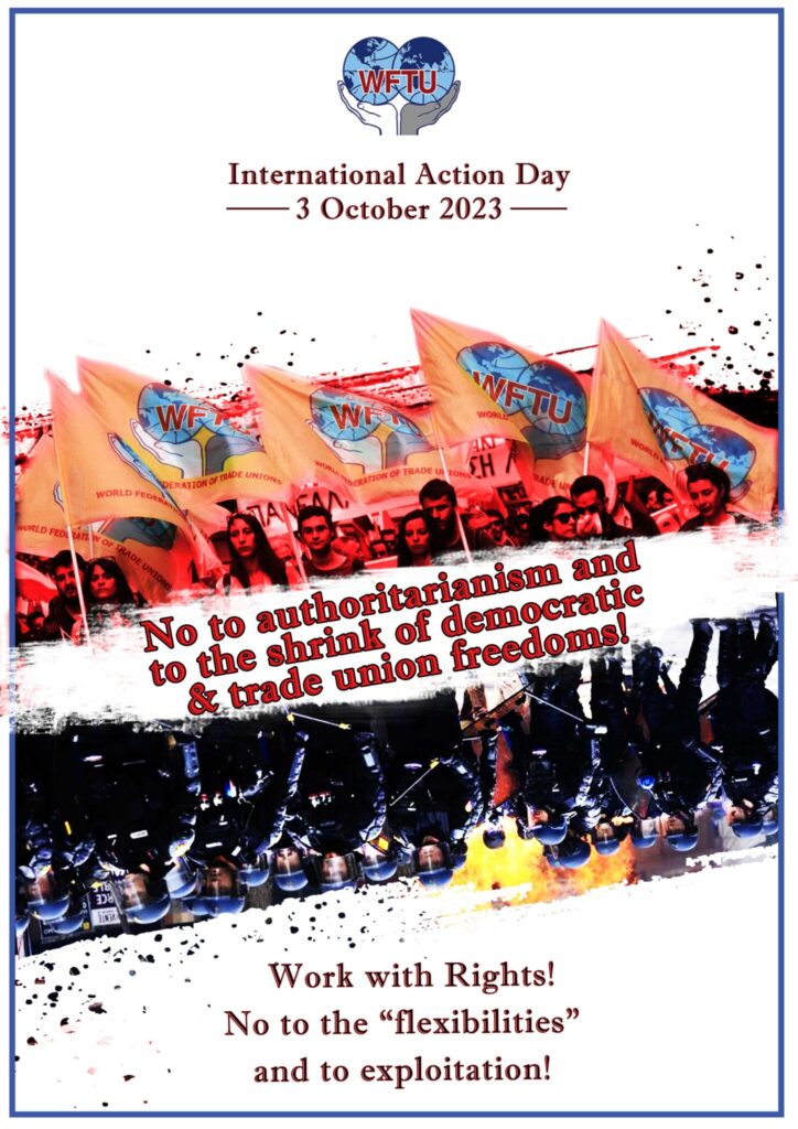 The World Federation of Trade Unions on the 3rd October, celebrates again this year the historic date of its founding by declaring the International Action Day, which this year focuses on the defence of democratic and trade union freedoms against authoritarianism and repression and the struggle to protect the right to organise, collective bargaining and the sacred right to strike. We intensify our struggle for permanent, stable, and regulated work with collective bargaining and social rights.
