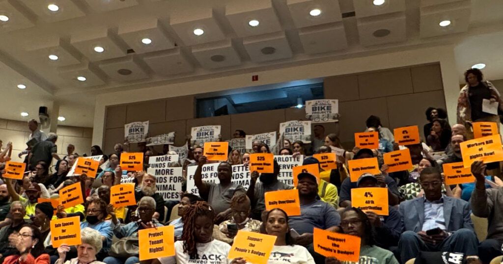 DURHAM & CHARLOTTE, NC—After over a year of organizing and turning members out to actions, city worker chapters of Local 150 successfully pressured Durham and Charlotte City Councils to approve millions in raises for public workers in the 2024-2025 fiscal year. On average, full time workers in Durham on the general step plan will receive a raise of over $8,000. Workers with more years of service will receive higher wage increases with some totaling over $15,000. In Charlotte, members won a six percent raise and an increase in the minimum starting salary, which is now $23 dollars an hour.