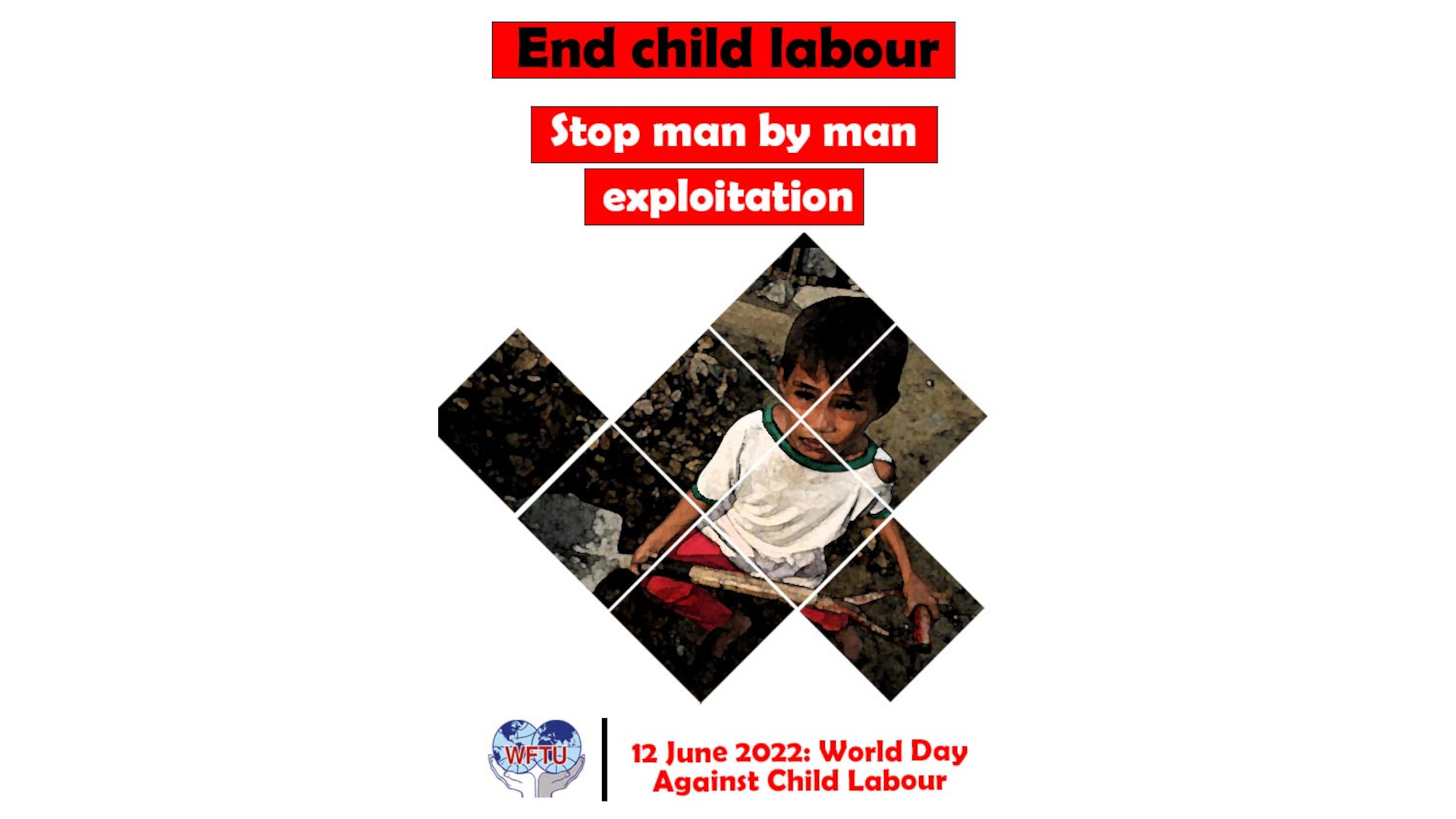 On this International day against child labour, World Federation of Trade Union, with all its affiliates across the globe, recommits itself to the firm resolve to fight against all forms of exploitation of children. WFTU in most vociferous terms says, “Stop child labour; Restore the right of children to a childhood!”