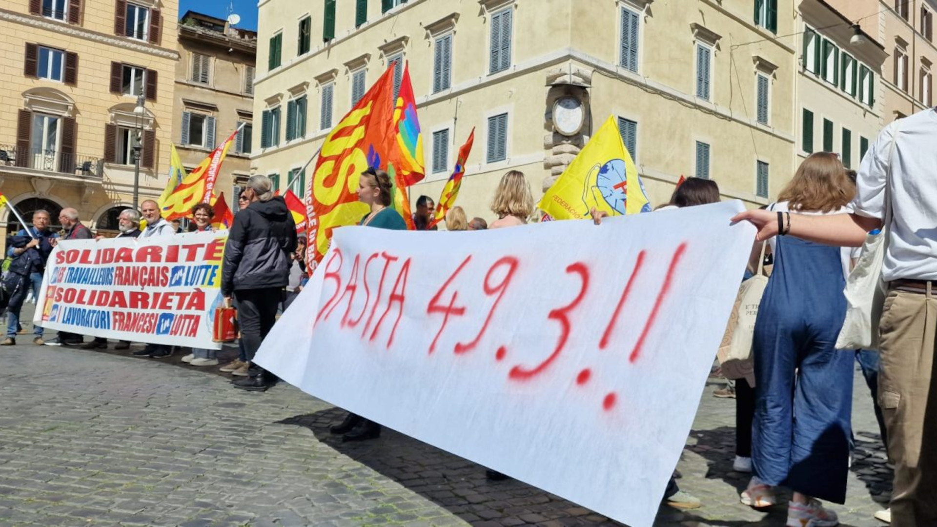 The Italian workers in the square were joined by numerous French citizens – including many young people – with placards against the pension reform and against the anti-democratic methods of Macron, who used an expedient, Article 49-3 of the French Constitution, to pass his law without going through Parliament.