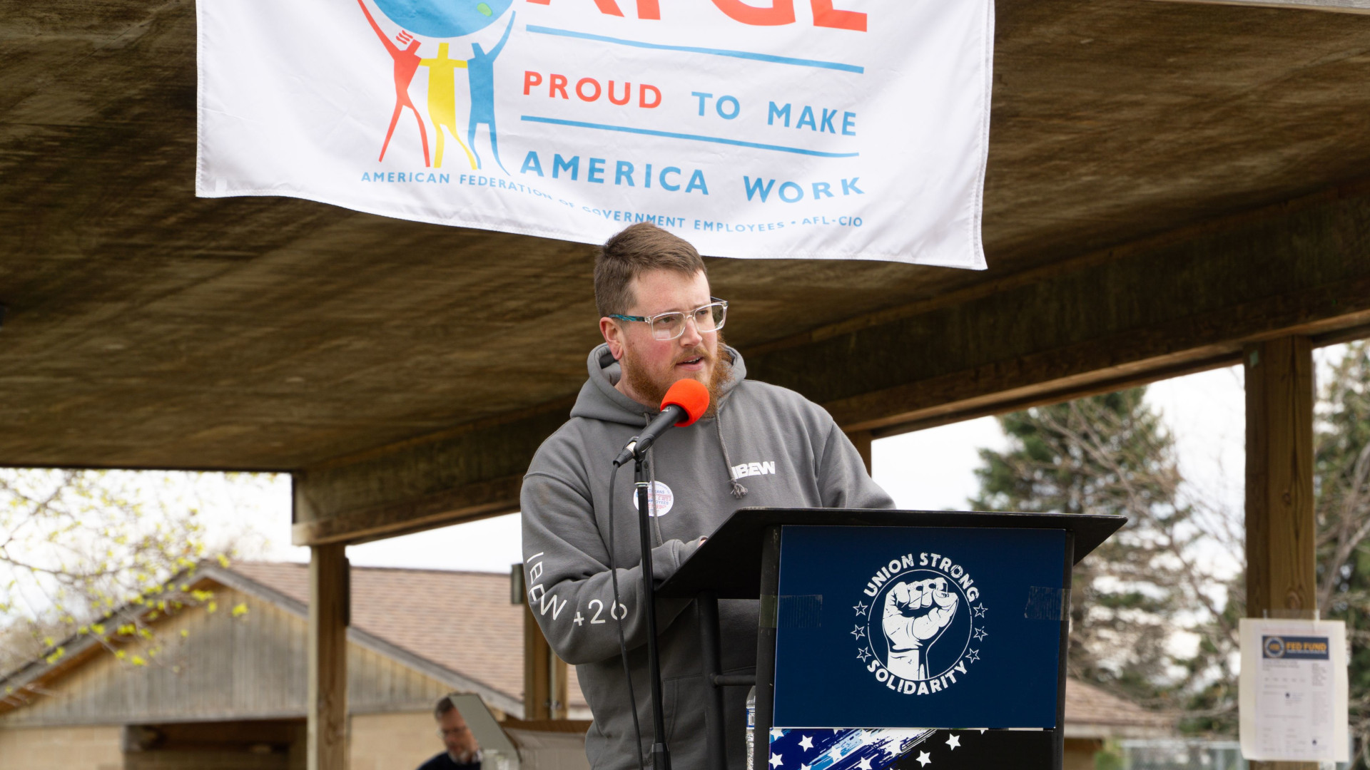 Good afternoon brothers and sisters. My name is M. Drezner and I represent the International Brotherhood of Electrical Workers Local 426 right here in Sioux Falls. I’m proud to be here with all of you today to take a stand against what the Trump administration is doing to our unions representing federal workers. Right now, workers at AFGE and other unions representing government employees are in a fight to preserve collective bargaining, a cornerstone of the labor movement. The working class movement has always been at its strongest when workers band together to fight for respect and dignity in the workplace. Now viewing this strength as a threat, the Trump administration is working to dismantle these unions which represent hundreds of thousands of workers across the country.